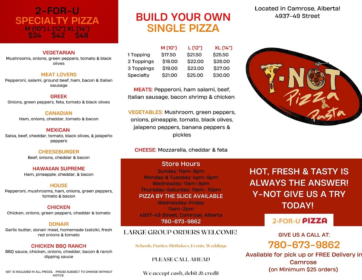 Welcome to Y-NOT PIZZA & PASTA LTD., nestled in the heart of Camrose, Alberta. This pizzeria is quickly becoming renowned for its exceptional quality and service, boasting some of the best pizza in town.